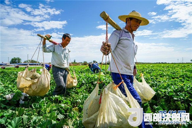6月27日,新疆哈密市伊州區(qū)南湖鄉(xiāng)瓜農在挑運哈密瓜。