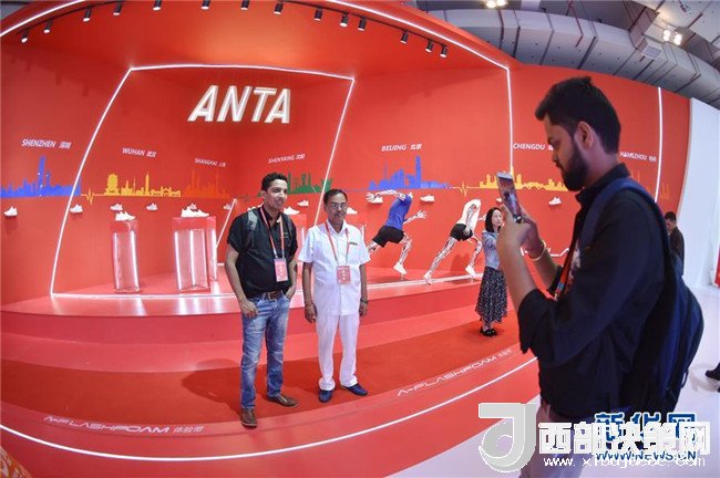 在一年一度的中國(晉江)國際鞋業(yè)暨國際體育產業(yè)博覽會上,來自印度的客商在安踏展位前留影(4月19日攝)。新華社記者 宋為偉 攝