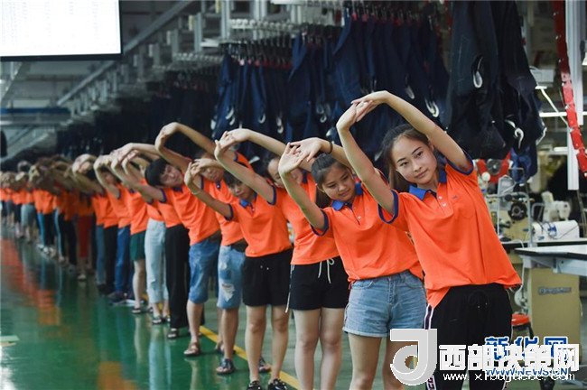 在位于晉江市的柒牌時裝科技股份有限公司黨建示范車間,工人在做工間操(6月19日攝)。新華社記者 宋為偉 攝