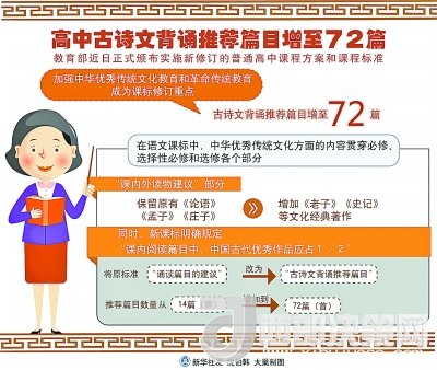 其中,語文課標(biāo)最突出,中華優(yōu)秀傳統(tǒng)文化方面的內(nèi)容貫穿必修、選擇性必修和選修各個部分。一是內(nèi)容更全,在“課內(nèi)外讀物建議”部分,除保留原有《論語》《孟子》《莊子》外,增加了《老子》《史記》等文化經(jīng)典著作,要求學(xué)生廣泛閱讀各類古詩文,覆蓋先秦到清末各個時期。二是分量更多,課程標(biāo)準(zhǔn)明確規(guī)定“課內(nèi)閱讀篇目中,中國古代優(yōu)秀作品應(yīng)占1/2”。三是要求更高,在全面加強的同時,還設(shè)置中華優(yōu)秀傳統(tǒng)文化學(xué)習(xí)專題,進行中華傳統(tǒng)文化經(jīng)典作品深入學(xué)習(xí)研討。將原標(biāo)準(zhǔn)“誦讀篇目的建議”改為“古詩文背誦推薦篇目”,推薦篇目數(shù)量也從14篇(首)增加到72篇(首),提高了學(xué)習(xí)要求。