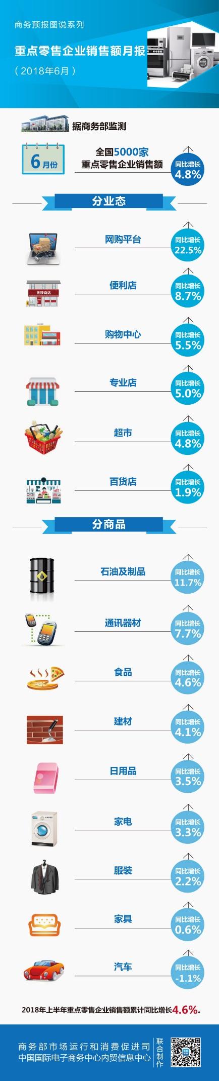 據(jù)商務(wù)部監(jiān)測(cè),2018年6月,全國(guó)5000家重點(diǎn)零售企業(yè)銷售額同比增長(zhǎng)4.8%。上半年重點(diǎn)零售企業(yè)銷售額累計(jì)同比增長(zhǎng)4.6%。