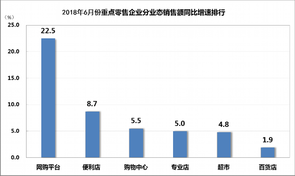 網(wǎng)購(gòu)平臺(tái)銷售額同比增長(zhǎng)22.5%,便利店、購(gòu)物中心、專業(yè)店銷售額同比分別增長(zhǎng)8.7%、5.5%、5.0%,超市、百貨店銷售額同比分別增長(zhǎng)4.8%和1.9%。