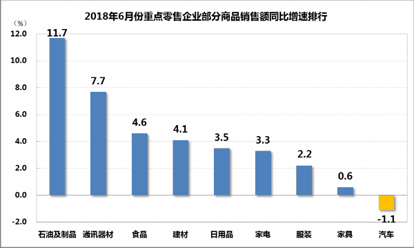 食品、日用品、服裝銷售額同比分別增長(zhǎng)4.6%、3.5%和2.2%,家電、建材、家具同比分別增長(zhǎng)3.3%、4.1%和0.6%,石油及制品同比增長(zhǎng)11.7%,通訊器材同比增長(zhǎng)7.7%,汽車同比下降1.1%。