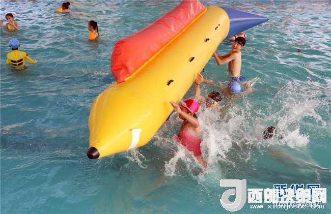 7月21日,小朋友在山東省棗莊市文化廣場(chǎng)游泳池內(nèi)戲水度暑。 新華社發(fā)(孫中喆 攝)