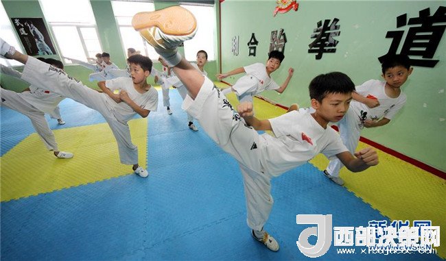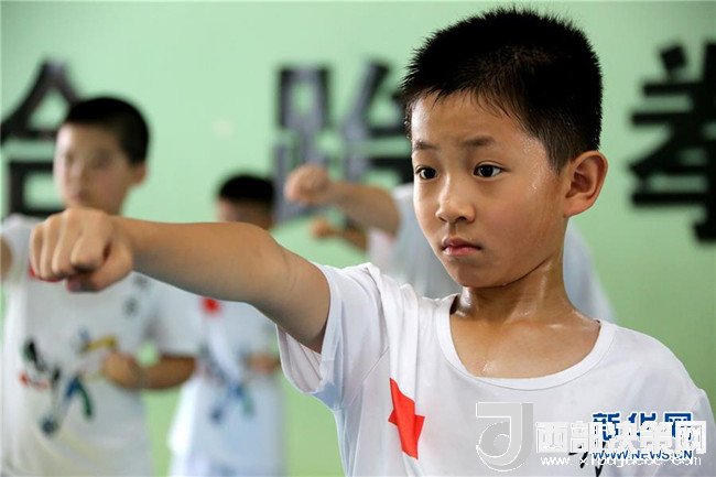 8月2日,小朋友在山東省棗莊市一家跆拳道館練習(xí)跆拳道。 新華社發(fā)(孫中喆 攝)