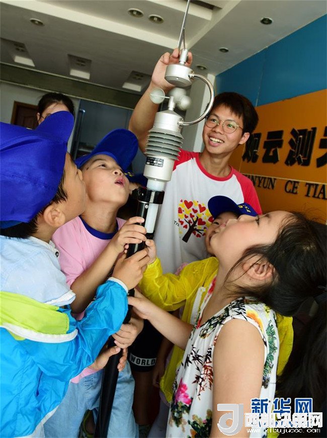 8月2日,江蘇鎮(zhèn)江市寶塔路街道潤(rùn)州花園社區(qū)的小朋友在丹徒國家基本氣象站觀察體驗(yàn)便攜自動(dòng)氣象站的功能。 新華社發(fā)(石玉成 攝)