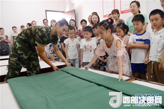 8月2日,湖北省宜昌市秭歸縣實(shí)驗(yàn)小學(xué)的學(xué)生和家長(zhǎng)在縣消防中隊(duì)體驗(yàn)整理內(nèi)務(wù)。 新華社發(fā)(王輝富 攝)