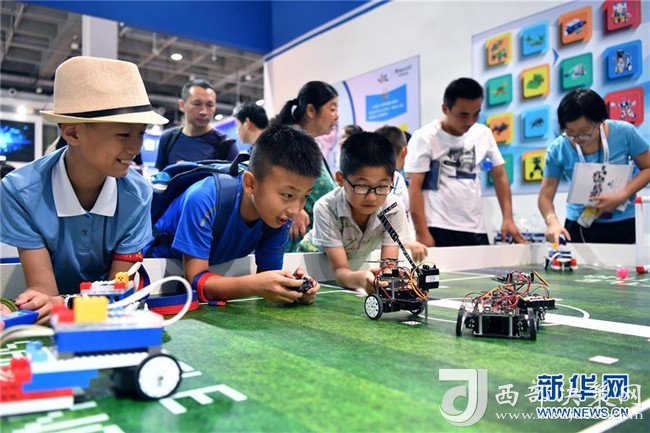 三名少年在2018世界機(jī)器人大會一處展臺體驗編程機(jī)器人(8月15日攝)。 新華社記者 李鑫 攝