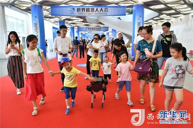 孩子們在2018世界機(jī)器人大會上跟隨一款四足機(jī)器人(8月15日攝)。 新華社記者 李鑫 攝
