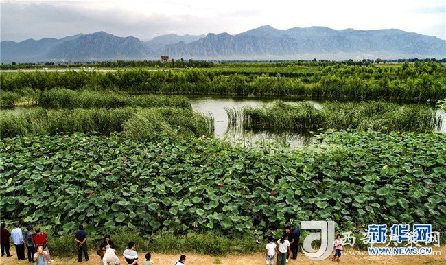 8月22日,游人在廣靈縣壺流河濕地觀賞盛開的荷花(無人機(jī)拍攝)。新華社記者 陶明 攝