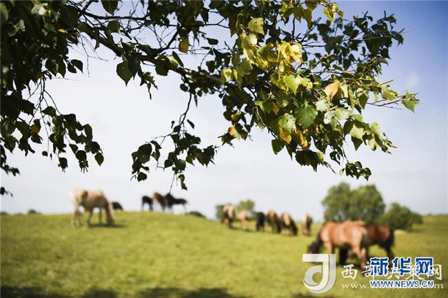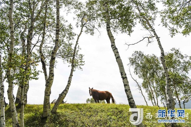 9月1日,兩匹馬在內(nèi)蒙古烏蘭布統(tǒng)草原的樺樹下吃草。
