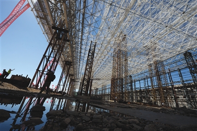 昨日,工作人員在為鋼結構屋頂最后的一次提升做準備。