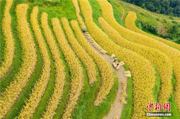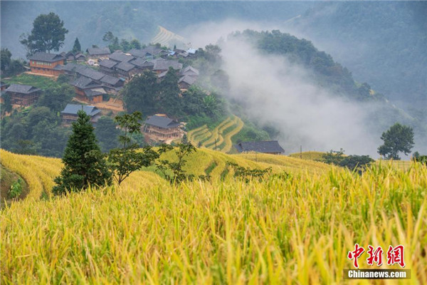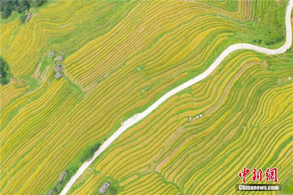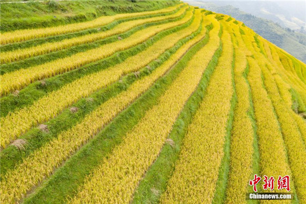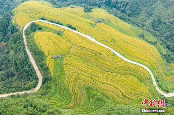 金秋時(shí)節(jié),貴州省榕江縣計(jì)劃鄉(xiāng)陽開梯田水稻進(jìn)入成熟期,金黃色的梯田構(gòu)成了一幅美麗的秋天圖景。