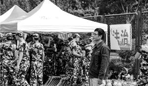 郇政華和穿著軍訓(xùn)服的新生們?cè)谛@里。