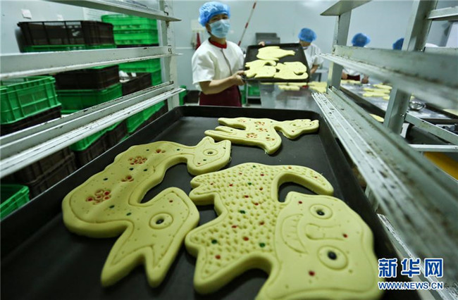 9月18日,在甘肅張掖一家超市的主食加工車間,工作人員將制作好的“土月餅”放入運輸架準(zhǔn)備送入烤爐。