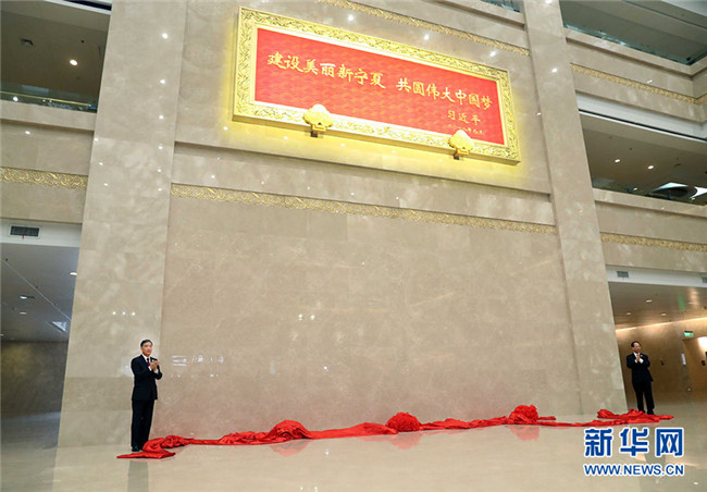 在贈送紀念品儀式上,汪洋和寧夏回族自治區(qū)黨委書記、人大常委會主任石泰峰,一同為習近平總書記題詞賀匾揭幕。