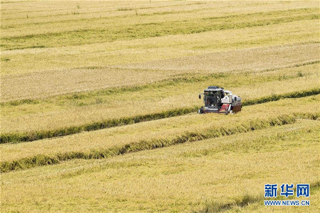 9月26日,收割機在新疆察布查爾錫伯自治縣納達齊牛錄鄉(xiāng)的一處稻田收割水稻。眼下,地處新疆伊犁河谷的察布查爾錫伯自治縣約20萬畝水稻迎來收割季。當?shù)剞r(nóng)民搶抓農(nóng)時,忙碌在金色田園中。記者 胡虎虎 攝