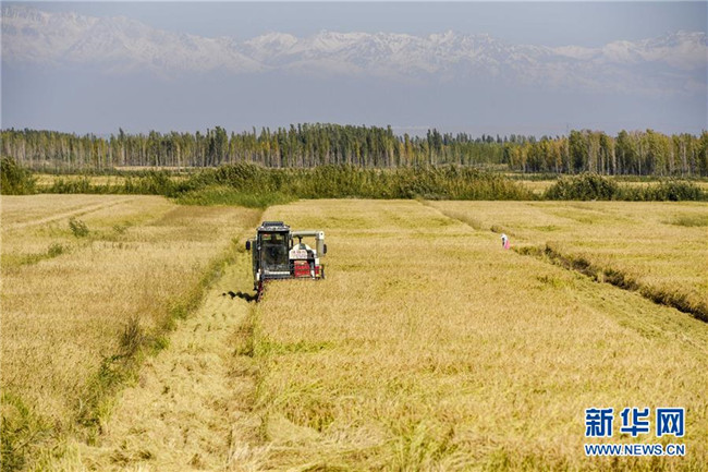 9月26日,收割機在新疆察布查爾錫伯自治縣種羊場的一處稻田收割水稻。眼下,地處新疆伊犁河谷的察布查爾錫伯自治縣約20萬畝水稻迎來收割季。當?shù)剞r(nóng)民搶抓農(nóng)時,忙碌在金色田園中。記者 胡虎虎 攝