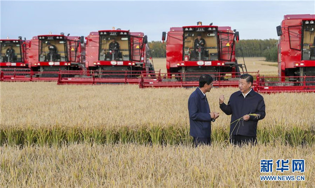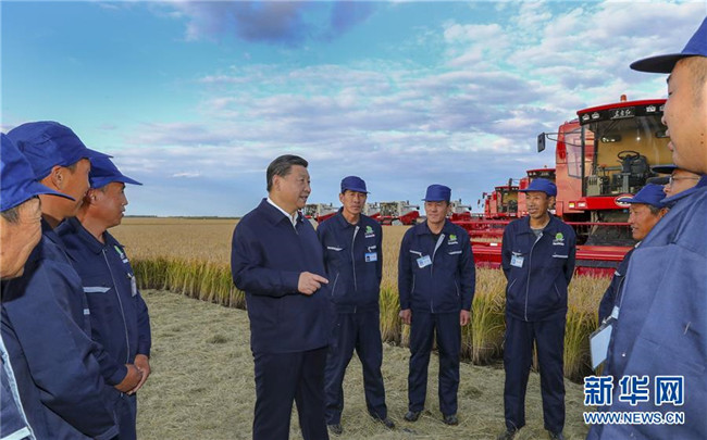 9月25日至28日,中共中央總書記、國家主席、中央軍委主席習近平在東北三省考察,主持召開深入推進東北振興座談會。這是25日下午,習近平在黑龍江農墾建三江管理局七星農場萬畝大地號了解糧食生產和收獲情況。 新華社記者 謝環(huán)馳 攝