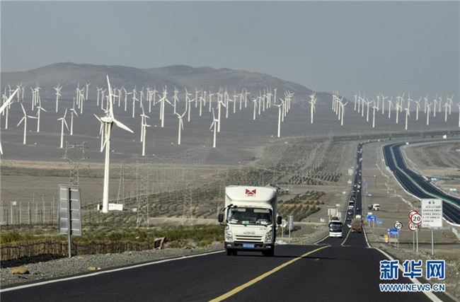 汽車行駛在新疆吐魯番市郊區(qū)風(fēng)力發(fā)電場(chǎng)一旁的公路上(9月22日攝)。記者趙戈 攝