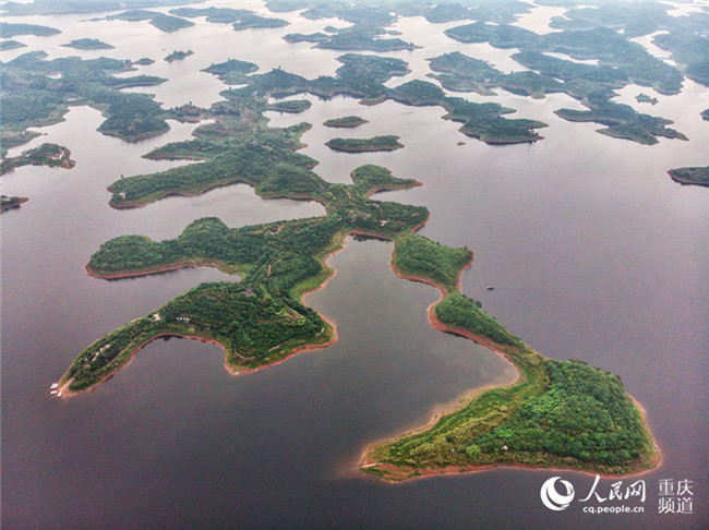 俯瞰長壽湖,十幾個首尾相接的島嶼呈現(xiàn)出繁寫的魏碑體“壽”字狀。羅嘉 航拍俯瞰長壽湖,十幾個首尾相接的島嶼呈現(xiàn)出繁寫的魏碑體“壽”字狀。羅嘉 航拍