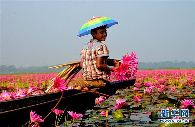 10月7日,在孟加拉國巴里薩爾地區(qū),一名兒童在采摘睡蓮。 近日,孟加拉國巴里薩爾地區(qū)的睡蓮進(jìn)入盛開時(shí)節(jié)。 新華社發(fā)(薩利姆·禮薩 攝)