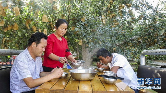 甘永軍(左一)在地處新疆阿克蘇地區(qū)柯柯牙綠化工程內(nèi)的果園吃飯(2017年9月22日攝)。10年前,甘永軍還在果園開起了第一個(gè)農(nóng)家樂,帶動(dòng)周邊100多戶果農(nóng)經(jīng)營起了自家庭院。新華社記者 杜剛 攝