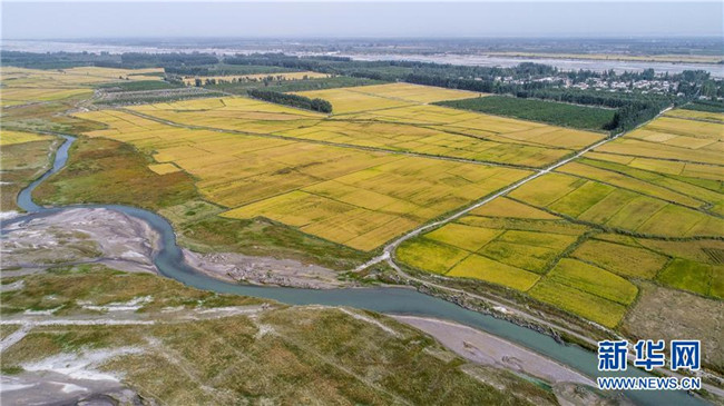 這是在地處阿克蘇河上游的溫宿縣托甫汗鎮(zhèn)阿亞克其村拍攝的一處由生態(tài)防護(hù)林守護(hù)的稻田(9月23日無人機(jī)拍攝)。新華社記者 胡虎虎 攝