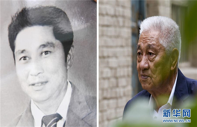 拼版照片:左圖為柯柯牙林管站第一任站長依馬木·麥麥提調(diào)任林管站長時(shí)的照片;右圖為已退休的依馬木·麥麥提向記者講述柯柯牙綠化工程(9月22日攝)。新華社記者 胡虎虎 攝