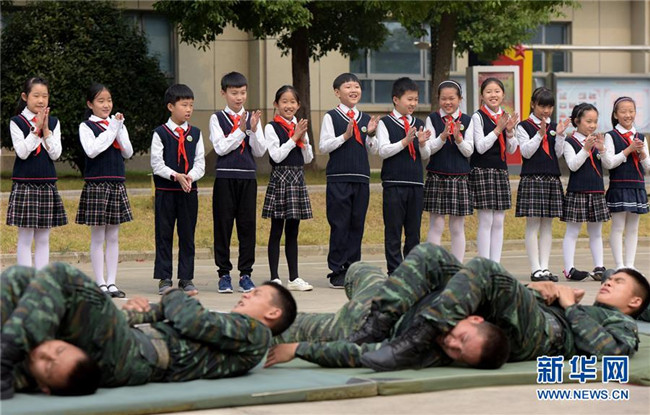 10月9日,少先隊員們在武警安徽總隊合肥支隊體驗官兵訓(xùn)練。