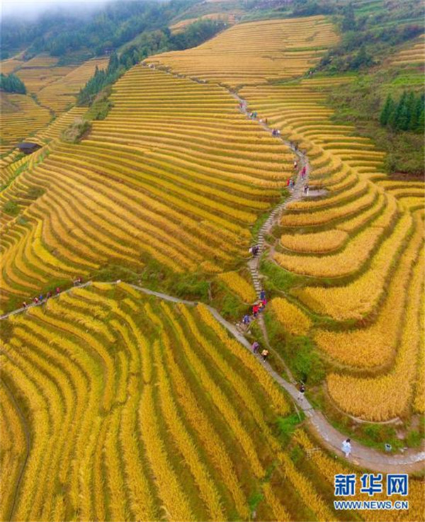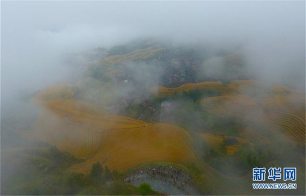 10月16日,游客在秋雨中欣賞龍脊梯田秋色(無人機(jī)拍攝)。金秋時節(jié),廣西龍勝各族自治縣龍脊梯田美如畫卷。 新華社記者 黃孝邦 攝