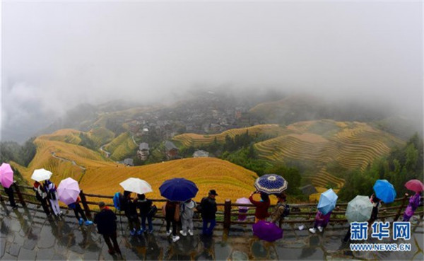 10月16日,游客在秋雨中欣賞龍脊梯田秋色。金秋時節(jié),廣西龍勝各族自治縣龍脊梯田美如畫卷。 新華社記者 黃孝邦 攝
