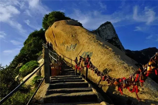 華山以石著名,每一處奇石都有一個(gè)美麗而動(dòng)人的傳說(shuō)。過(guò)了擦耳崖,看到的這兩塊石頭叫“日月巖”,左邊的代表“日”,右邊的代表“月”,上面這四個(gè)字是“云天弧光”,有時(shí)在夜晚,這里會(huì)出現(xiàn)一道非常耀眼的光。相傳武則天當(dāng)年上華山走這里,看到這兩塊形似日月的石頭,就別出心栽地給自個(gè)兒的字號(hào)創(chuàng)造了一個(gè)“瞾”字,因?yàn)檫@兩塊奇石上頂青天,下臨空谷,唯我獨(dú)尊,是光明與權(quán)威的象征。