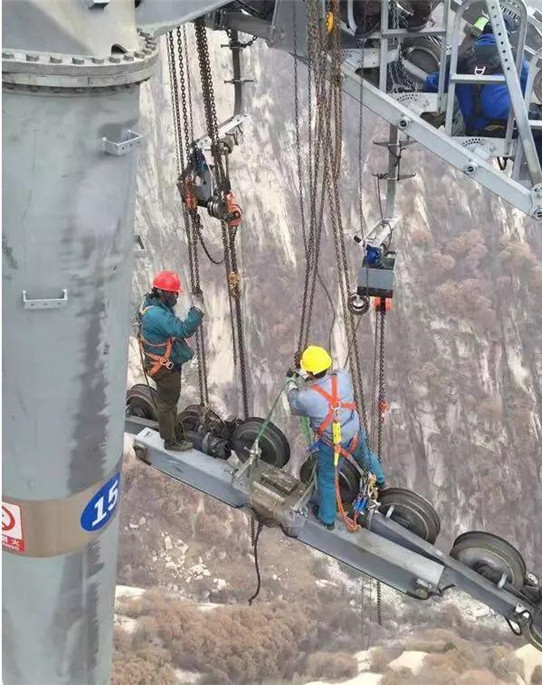 當發(fā)現(xiàn)索道支架有異響時,維護工就要上支架了。從檢修車車廂里翻出來、順著掛在鋼索下的車臂攀緣上去,越過鋼絲繩,跨上支架,維護工開始工作。最高的支架65米,站在高聳入云的支架上,有一種站在懸崖邊的感覺。