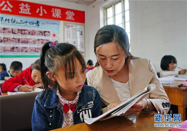 10月23日,李飛燕在提鈴寨村“愛(ài)心公益小課堂”為學(xué)生輔導(dǎo)功課。