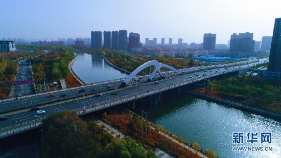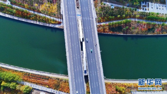 車輛從呼和浩特環(huán)城水系的一座橋上駛過(guò)。新華網(wǎng)發(fā) (樂(lè)炎 攝)