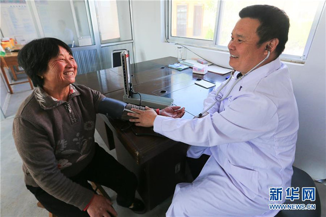 在山東蒙陰縣云夢湖生態(tài)區(qū)東汶社區(qū)的農(nóng)村幸福院養(yǎng)老院的醫(yī)務(wù)室,醫(yī)生為老人測量血壓(10月11日攝)。2016年,東汶社區(qū)將原來的村兩委大院擴建為農(nóng)村幸福院養(yǎng)老院,委派專人負責老人們的一日三餐。同時按照“子女交納、集體補助、社會捐贈、財政獎勵”的模式設(shè)立孝心養(yǎng)老基金,每月定時發(fā)給貧困老人。新華社記者 王南 攝