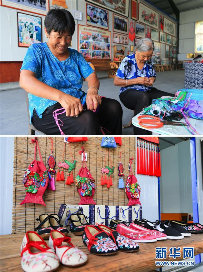 拼版照片(8月22日攝):上圖在山東費縣朱田鎮(zhèn)崔家溝社區(qū)的居家靈活就業(yè)培訓中心,當?shù)卮迕裨诳p制手工飾品;下圖當?shù)卮迕窨p制的手工飾品和布鞋(8月22日攝)。崔家溝村是遠近聞名的“光棍村”“貧困村中的貧困村”。2016年3月,崔家溝村在中央異地搬遷政策的扶持下,實現(xiàn)了整體搬遷,1600多口人搬到了鎮(zhèn)駐地。從此,昔日的“光棍村”,一躍進入朱田鎮(zhèn)富裕村行列。新華社記者 王南 攝