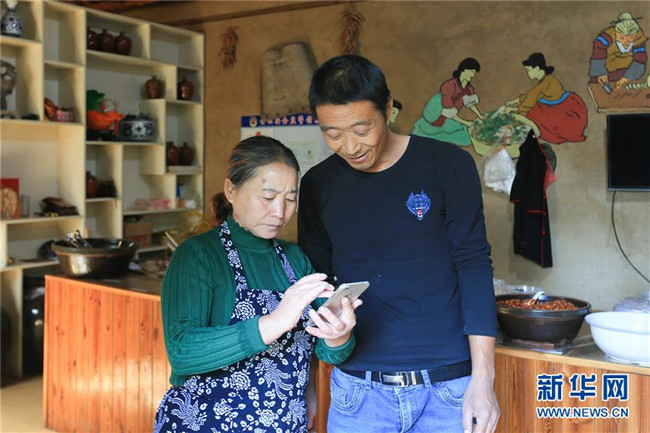 夏永春與妻子用手機查看訂單(10月10日攝)。貧困戶夏永春兩口子靠著地道鄉(xiāng)土手藝,在山東蘭陵縣金嶺鎮(zhèn)壓油溝風景區(qū)里開了一家農(nóng)家特色咸菜坊,年收入一下躥升到七八萬元。新華社記者 王南 攝