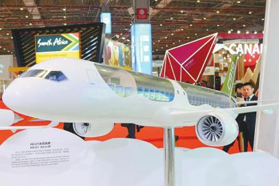 進(jìn)口博覽會上展出的ARJ21支線客機(jī)模型。本版攝影 記者 李向雨