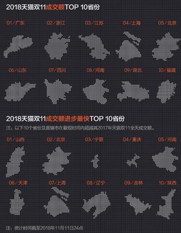 不過,今年最亮眼的地域榜單來自“進(jìn)步”飛快的10個(gè)大省——它們以最快的速度實(shí)現(xiàn)了對(duì)2017年全天成交額的超越。除了北京、重慶、上海和河南,山西、寧夏、河南、天津、遼寧、吉林、陜西都屬于名副其實(shí)的“剁手新生代”。