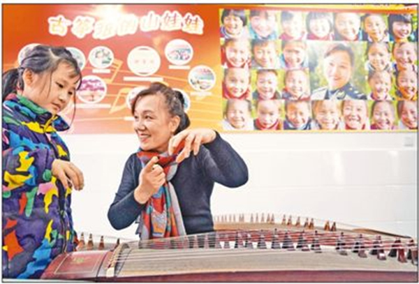 安徽省金寨縣梅山鎮(zhèn)小南京村“山娃娃古箏班”創(chuàng)辦4年來,為三十幾名留守兒童帶來溫暖。創(chuàng)辦人俞曉冬原為南京軍區(qū)前線文工團(tuán)國家一級古箏演奏家。2014年,她自籌資金20多萬元購置40多架古箏,在小南京學(xué)校建起一間古箏教室,利用音樂課、課余和周末時間無償對山村留守兒童進(jìn)行古箏培訓(xùn)和音樂教育。一年中,俞曉冬有150多天都住在學(xué)校,與山娃們朝夕相處,孩子們親切地稱她為“古箏媽媽”。一批批山娃娃在小學(xué)畢業(yè)前通過全國器樂水平十級考試,還多次參加國內(nèi)公益演出。圖為俞曉冬老師在教留守兒童學(xué)古箏。(趙樹宴/攝)