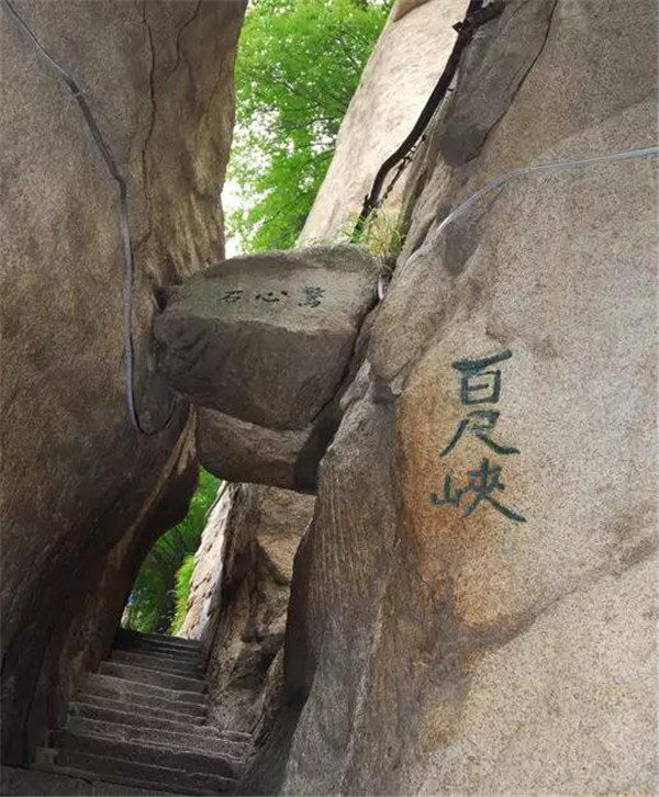 也叫“百丈崖”,過(guò)了千尺幢向北折即可到達(dá),是登華山的第二個(gè)險(xiǎn)境。這里山體峭陡壁立、四方如削,猶如斧子直辟而開,幾近垂直90度,在旁邊山體覆滿的墨綠植被的映襯下,華山的陽(yáng)剛挺拔之態(tài)盡顯。和千尺幢一樣,百尺峽也是巖隙險(xiǎn)道,有石階91級(jí),游人須挽鐵索而上。