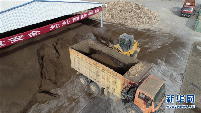 在寧夏青銅峽一家生物質(zhì)燃料生產(chǎn)企業(yè),工作人員操作機械將秸稈、廢棄木材制成的粉末裝車(11月27日無人機拍攝)。 新華社記者 王鵬 攝
