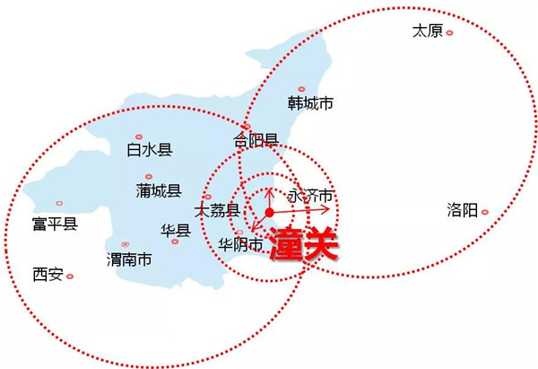 潼關(guān)地理位置優(yōu)越、歷史文化厚重,且居西安、太原、洛陽三大城市經(jīng)濟輻射圈的中心。距華山約20公里。