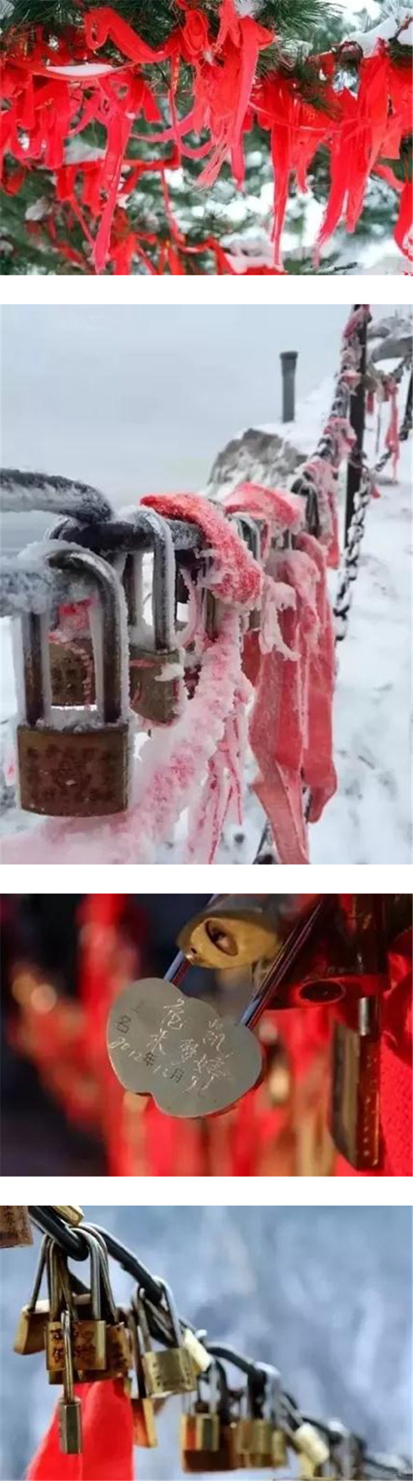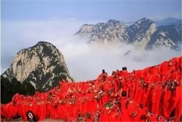 當(dāng)山風(fēng)徐徐吹來,長長的紅色絲繩就會(huì)隨風(fēng)輕盈的舞蹈起來,如輕盈的飛鳥,比翼雙飛將愛情的甜蜜帶到華山的每一個(gè)角落,將愛情的誓言印刻在每一塊充滿靈性的石頭上。