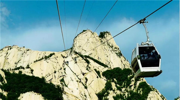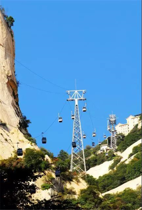 其實,而今作為旅游勝地的華山,已不似古人所記所述,登山道路平整而闊,道旁鐵鏈?zhǔn)瘷谙嘧o,已無危險之虞,可謂“險而無危”。如今,登頂華山的方式也已經(jīng)不止步行登山了,索道的建成使更多游人登頂華山的愿望成為現(xiàn)實。