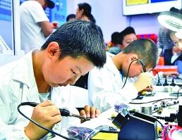 2018世界機(jī)器人大會(huì)上,小學(xué)生在焊接用于編程的模塊。新華社發(fā)