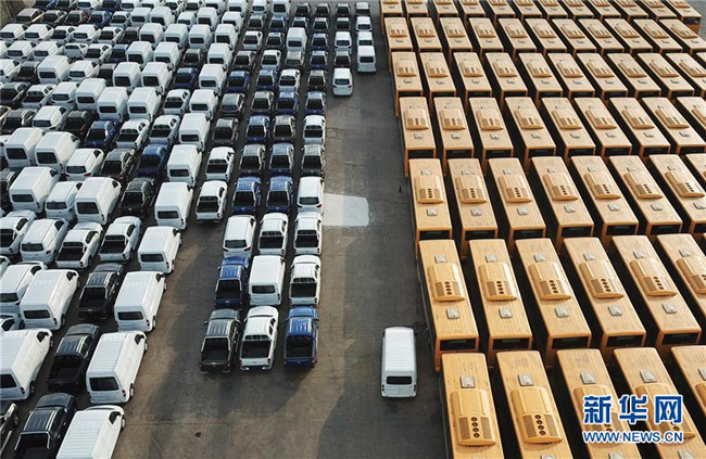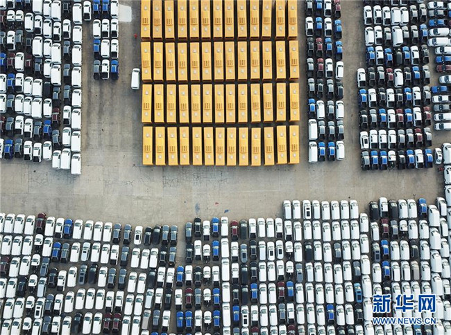 大批國產(chǎn)車輛在江蘇連云港港口碼頭等待裝船(2018年12月31日無人機拍攝)。新華社發(fā)(耿玉和 攝)