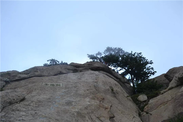 我和孩子抓緊時(shí)間往東峰趕,經(jīng)紫氣臺(tái)、二仙坎,攀爬一道石梁前往東峰山門。此時(shí)飄來小雨點(diǎn),我們顧不得腳下濕滑加快了腳步。經(jīng)鷂子翻身,孩子想要征服天險(xiǎn)的念頭依然強(qiáng)烈,一心想翻鷂子翻身,后因人多需排隊(duì)等候而暫時(shí)放棄。東峰又叫朝陽(yáng)峰,朝陽(yáng)臺(tái)是觀日出的勝地。我倆左轉(zhuǎn)攀爬朝陽(yáng)臺(tái),雨漸漸大起來。至臺(tái)頂,方舉目四顧,黃豆大小的密集雨點(diǎn)劈頭蓋臉砸下。朝陽(yáng)臺(tái)上沒有看到太陽(yáng),卻遭遇暴雨,我們狼狽撤離朝陽(yáng)臺(tái)。